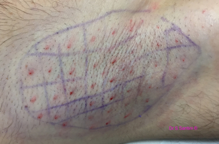 After a consultation, numbing cream is applied to the area to be treated (this area may need to be mapped out using iodine solution and corn flour in certain cases). A series of injection about